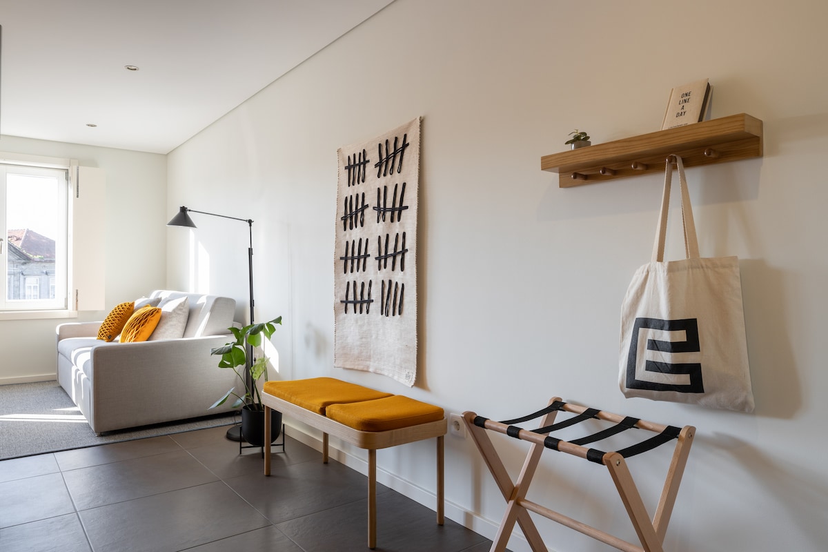 Located on the second floor, this apartment hosts four guests and features air conditioning, a washer, a meditation room/mini gym and a balcony facing Rua Santa Catarina. The lower-floor bedroom opens to the living room via a pocket door. Near Bolhão Market, Aliados and the Douro River. For guests traveling with little ones, a baby pack is available on request (€25) and includes a cot with linen, high chair, bathtub, baby amenities, and a baby towel.
