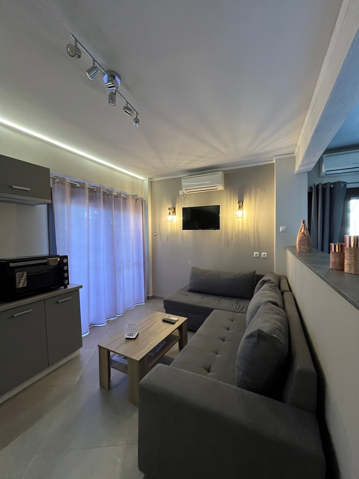 Experience the modern, serene apartment in front the beach , 10 mins from the airport and right in the center of the little sea side town Loutsa. Enjoy this modern spacious 1 bedroom , 1 bathroom apartment with sea views. This home accommodates a total of 4 guests , with a queen size bed in the bedroom and a full pull out bed that turns in to 2 beds in the living room. High end amenities and the serene design of the apartment will make your stay a memorable experience.