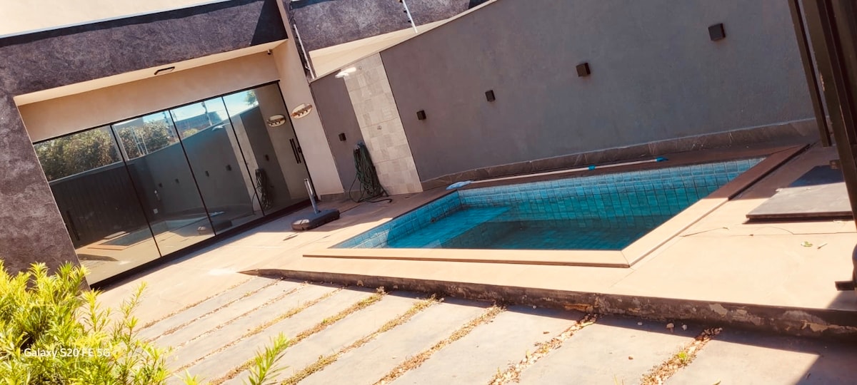 Ideal para grandes famílias ou grupos de amigos - 04 suítes, todas com ar condicionado, cama adicional, colchões extras de solteiros, piscina aquecida (aquecida a energia solar - depende de dias antecedentes de sol - comum na região) amplo espaço gourmet- churrasqueira (agora com Ar condicionado na área da cozinha- mesa de bilhar, lavabo, mesa de jantar e sala de TV... Wi Fi, garagem para 02 carros, área externa ampla. Localizado na área central, proximidades lanchonetes, mercados, farmácia