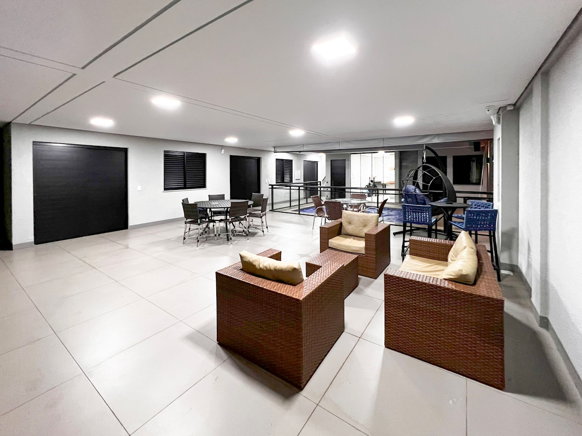 Ideal para grandes famílias ou grupos de amigos - 04 suítes, todas com ar condicionado, cama adicional, colchões extras de solteiros, piscina aquecida (aquecida a energia solar - depende de dias antecedentes de sol - comum na região) amplo espaço gourmet- churrasqueira (agora com Ar condicionado na área da cozinha- mesa de bilhar, lavabo, mesa de jantar e sala de TV... Wi Fi, garagem para 02 carros, área externa ampla. Localizado na área central, proximidades lanchonetes, mercados, farmácia
