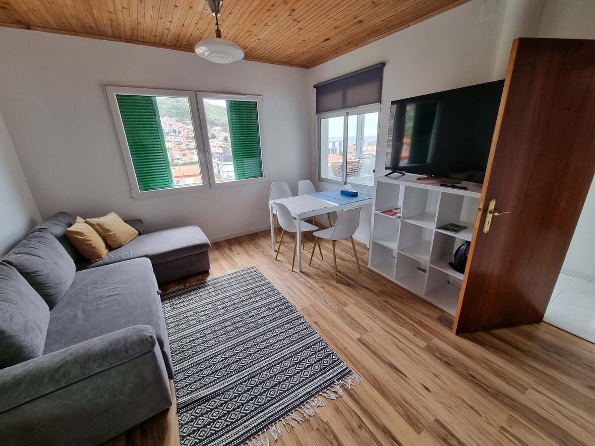 The Orca house is a T1 located on the top floor of the building. It has a room with capacity for 2 guests and a sofa bed with capacity for up to 1 more guest. The whole house has a simple mordern style and is fully equipped. The Orca house has a cozy atmosphere and the kitchen and dining room were built with an “Open Kitchen” ideology allowing for greater lighting throughout the space. It offers a rear outdoor space overlooking the village of Caniçal and a table that allows outdoor dining.