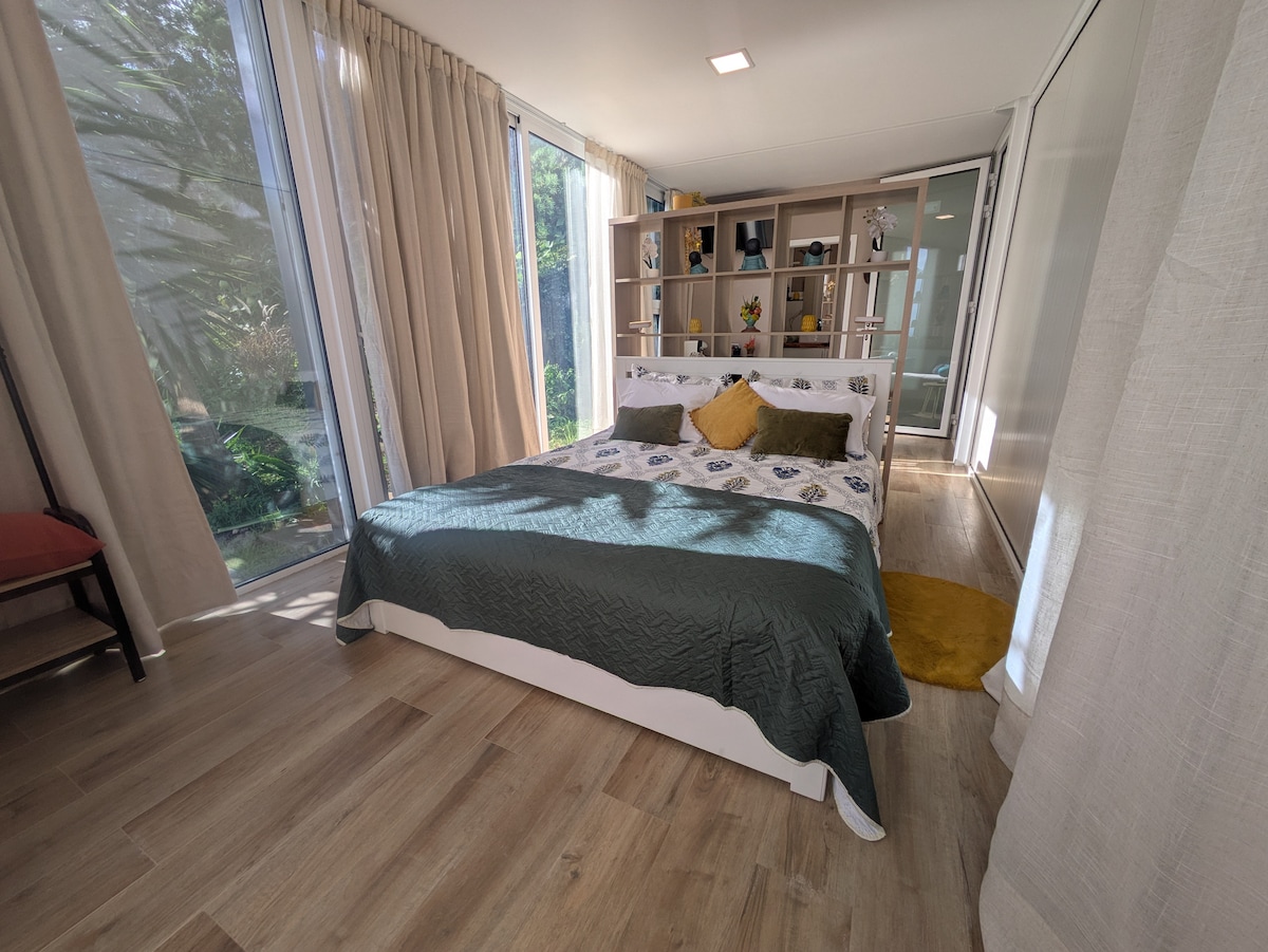 Estúdio privado no rés do chão de uma moradia moderna de tipo minimalista. Tem 1 quarto de dormir, uma casa de banho com duche, cozinha moderna em open space. Decoração simples e moderna, com muita luz natural.a família neste espaço elegante.