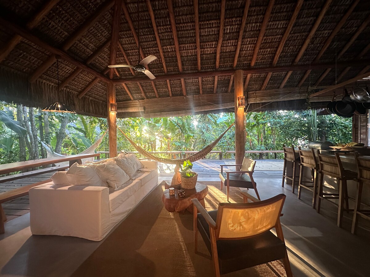 Casa nova integrada à mata, perfeita para relaxar, curtir a natureza, apreciar as flores e os pássaros, receber visitas de saguís e preguiças! Conta com 3 suítes, piscina com hidromassagem e prainha para crianças. Cozinha completa e churrasqueira. Redes para descansar em meio à natureza! A casa fica a 700 metros do quadrado de Trancoso, em poucos minutos você chega ao centro histórico da cidade! As praias estão a 1 km de distância, também acessíveis caminhando!