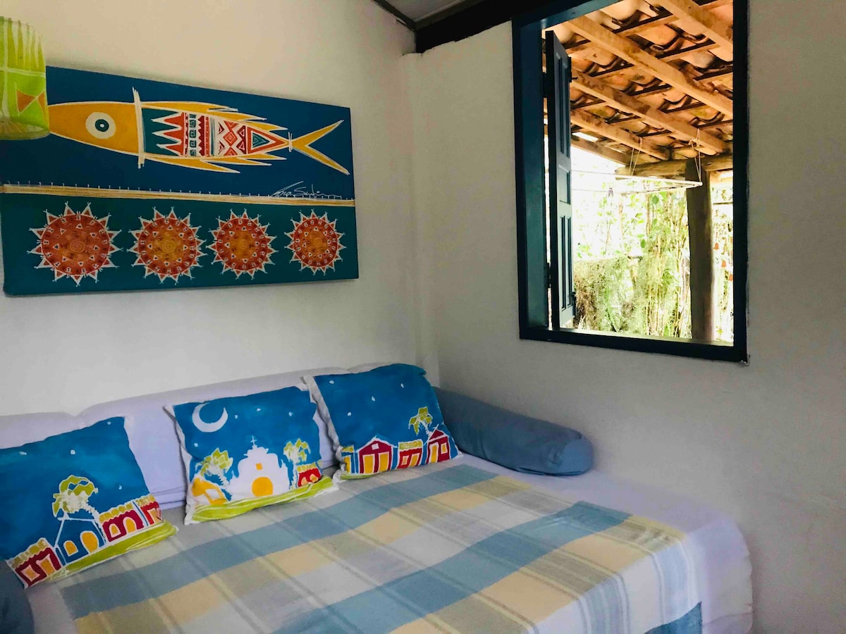 À 100 metros das mais belas e bem frequentadas praias do Arraial d'Ajuda, a do Araçaipe e do Apaga Fogo. Com acesso à praia bem em frente. Em meio a 3000m2 de área verde, localizado entre o rio e o mar, chalé aconchegante no condomínio privado, Salamandra, para quem gosta do contato com a Natureza e conforto. Privado, seguro, simples e tranquilo. Estilo rústico, decoração e iluminação agradáveis. Próximo às balsas para Porto Seguro e 3 km do centro de Arraial. Vc vai se sentir em casa!