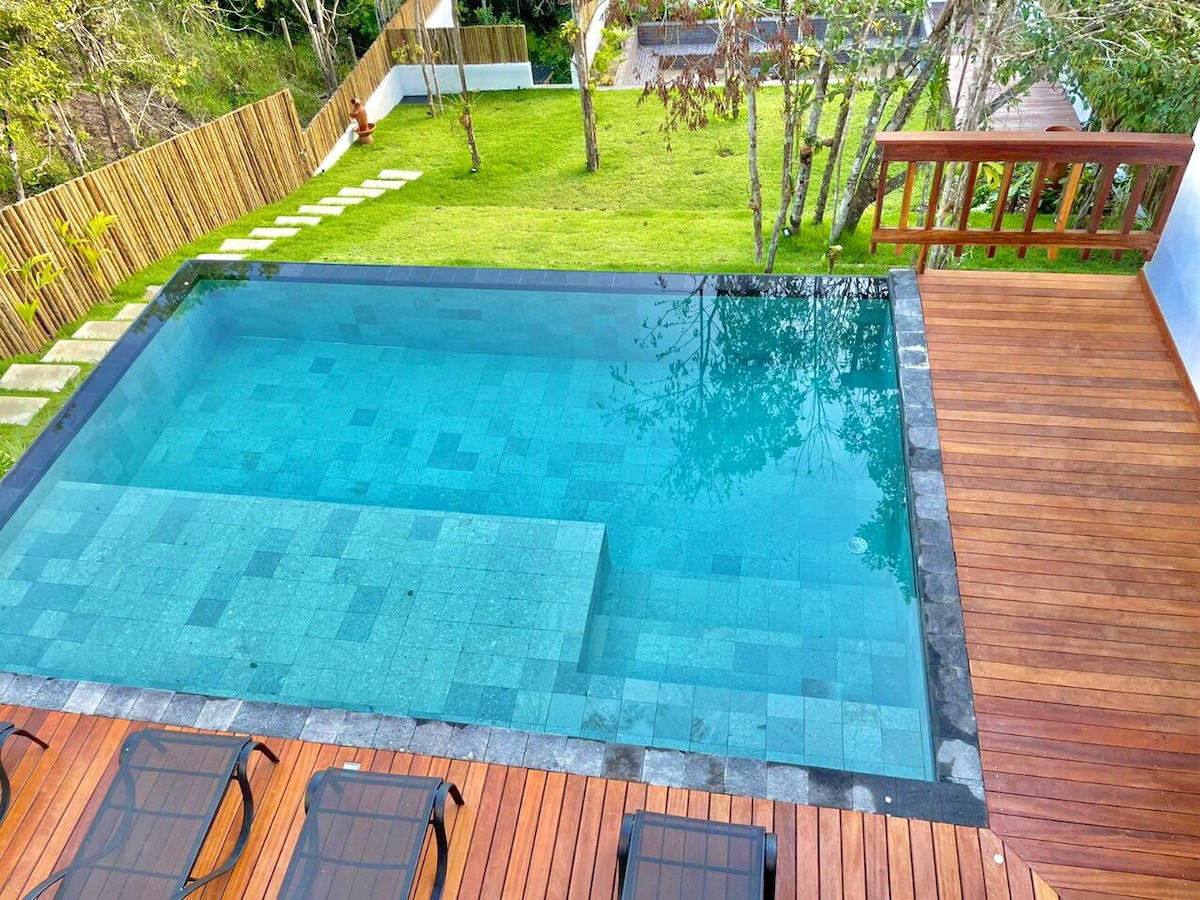 Take it easy at this unique and tranquil getaway. Our house is situated in a beautiful native forest of Arraial D’ajuda,with an amazing sea and valley view, approximately 5 minutes from Pitinga beach, which happens to be the best beach in town. Here you are totally immersed in nature, surrounded by only natural sounds, peace and quiet, with the luxury of being just a five minute drive to famous Mucuje Road Town center. .