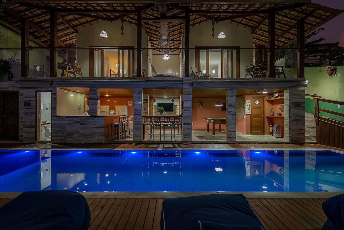 Condo House in Villa Maritaca, 3 suites (double and single bed) with air conditioning and fan, full kitchen with cooktop, microwave, and air fryer, living room with cable SmarTV, 100Mb WIFI, barbecue grill, and balcony, 5 minutes walk from Mucugê street. Parking with electronic gate, sand sports court, gourmet area, game room with pool table and SmartTV, pool with beach area and hydro jets, large deck with sun loungers and beautiful views of Mucuge Valley in perfect harmony with nature.