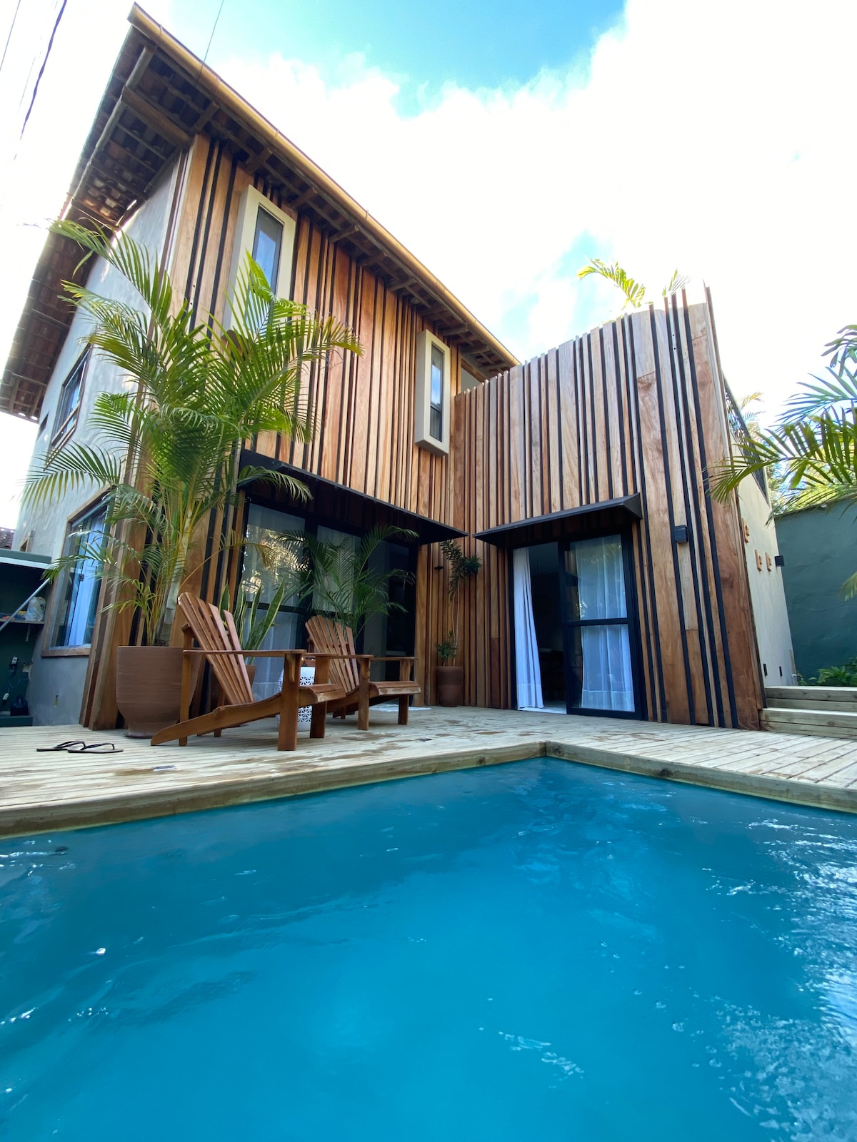Acomodação elegante em TRANCOSO perfeita para casais, famílias ou grupo de amigos. Duas suítes espaçosas com camas queen , ar condicionado e TV Smart. (1 solt ) 2 Banheiros amplos + banheiro social. A área social é em um ambiente único, amplo, arejado com sala de estar, sala de jantar e cozinha integradas. A luz do dia invade o ambiente e portas amplas abrem-se ao deck para que a casa vire uma grande varanda com piscina Churrasqueira privativa Local tranquilo e seguro a 1,6km do quadrado