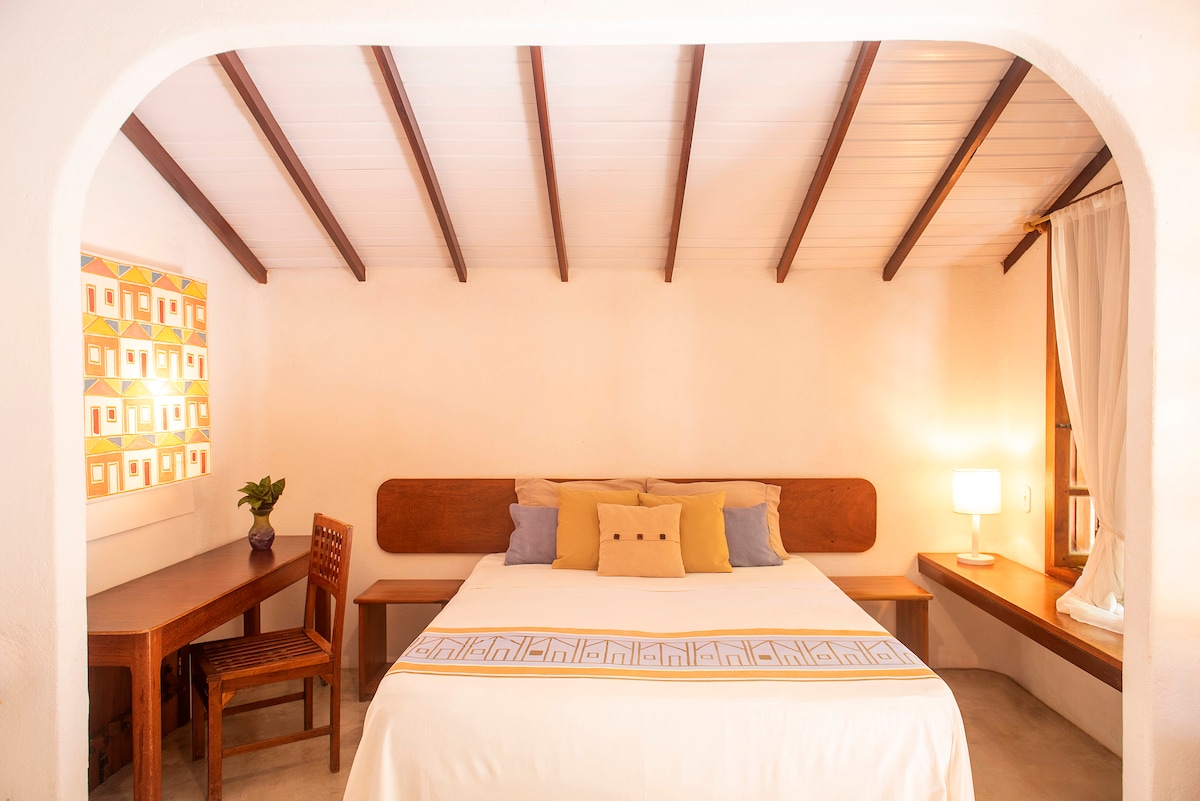 Suíte iluminada no segundo andar de casa MAMAZOO na praia de Caraíva com entrada, varanda e deck de madeira privativa com vista panorâmica para o ceu e o mar. A suíte faz parte da casa principal, atrás dos dois bangalôs. Tem cama queen, banheiro privativo, ar condicionado, frigobar, cafeteira electrica, pratos e talheres e copos. Um espaco ideal para descansar ou trabalhar.