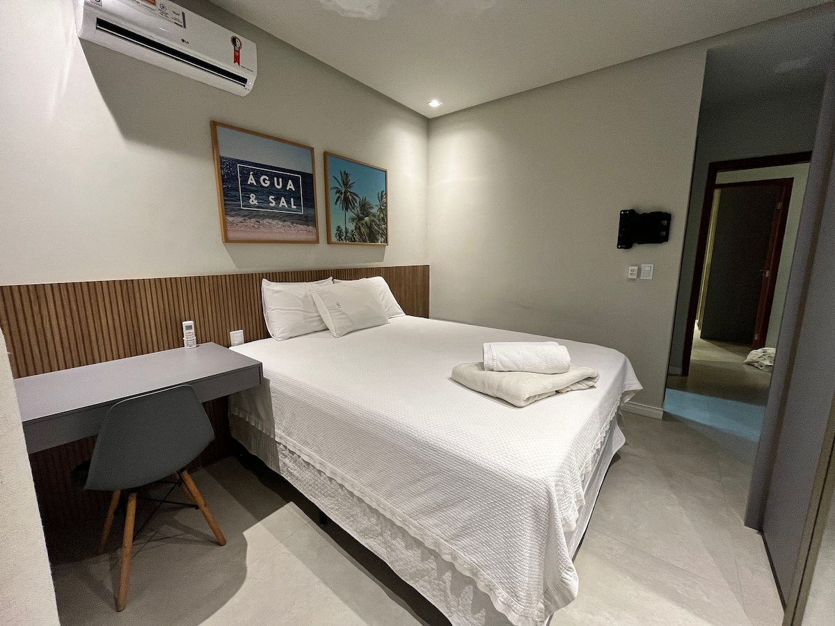 150 metros da praia de Taperapuã pertinho das barracas Axé Moi/Toa-Toa. Ar condicionado, 1 quarto (3 camas de solteiro ou 1 de casal e 1 de solteiro), sala de estar (com 1 bicama), kitchenette com microondas, geladeira, air fryer sanduicheira, liquidificador, cafeteira, 1 banheiro com bide. Toalhas e roupas de cama são fornecidas. Café da manha das 07h00 às 10h00. Sauna, parque infantil e piscina. Restaurante, bar, sala comum e WI-FI grátis. Estacionamento privativo gratuito e recepção 24 horas.