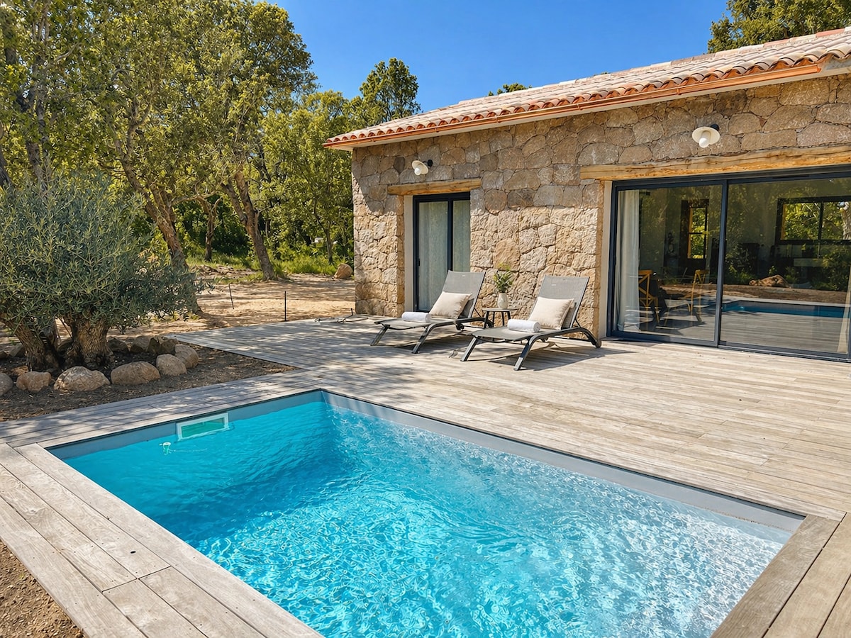 Maison traditionnelle corse inspirée des bergeries anciennes en pierre et bois. Confort moderne et piscine chauffée au coeur du maquis. Calme, vue montagne Il se compose d’une pièce à vivre avec coin cuisine, salon et cheminée et de 2 chambres avec salle d’eau. Il apporte tout le confort moderne nécessaire Idéalement situé : à mi-chemin entre Porto-Vecchio et Bonifacio, À proximité des plus belles plages de l’extrême sud de l’île. Non loin des sentiers du patrimoine et des sites incontournables