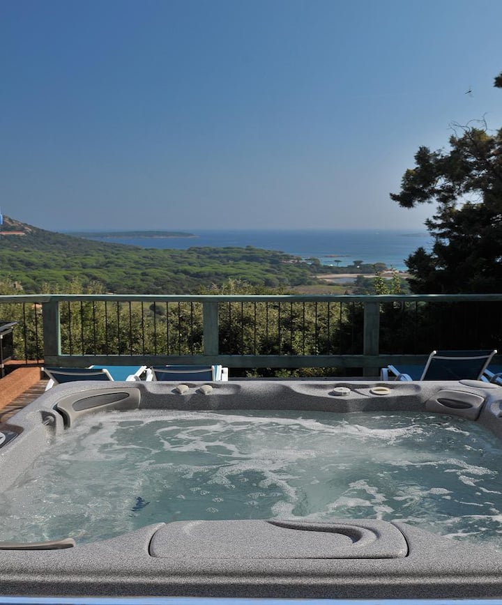 VILLA PANORAMIQUE avec VUE IMPRENABLE SUR MER ET PLAGE DE PALOMBAGGIA. Située sur les hauteurs de l'hôtel Relais & Châteaux Les Bergeries de Palombaggia, notre Villa - toute équipée - vous propose 4 chambres, une grande pièce de vie avec une terrasse proposant bains de soleil et jacuzzi, et tout le confort nécessaire pour faire de vos vacances, un moment privilégié au milieu du maquis corse. La plage , à 700 m de notre villa, est accessible en 15 min, par un chemin privé à pieds.