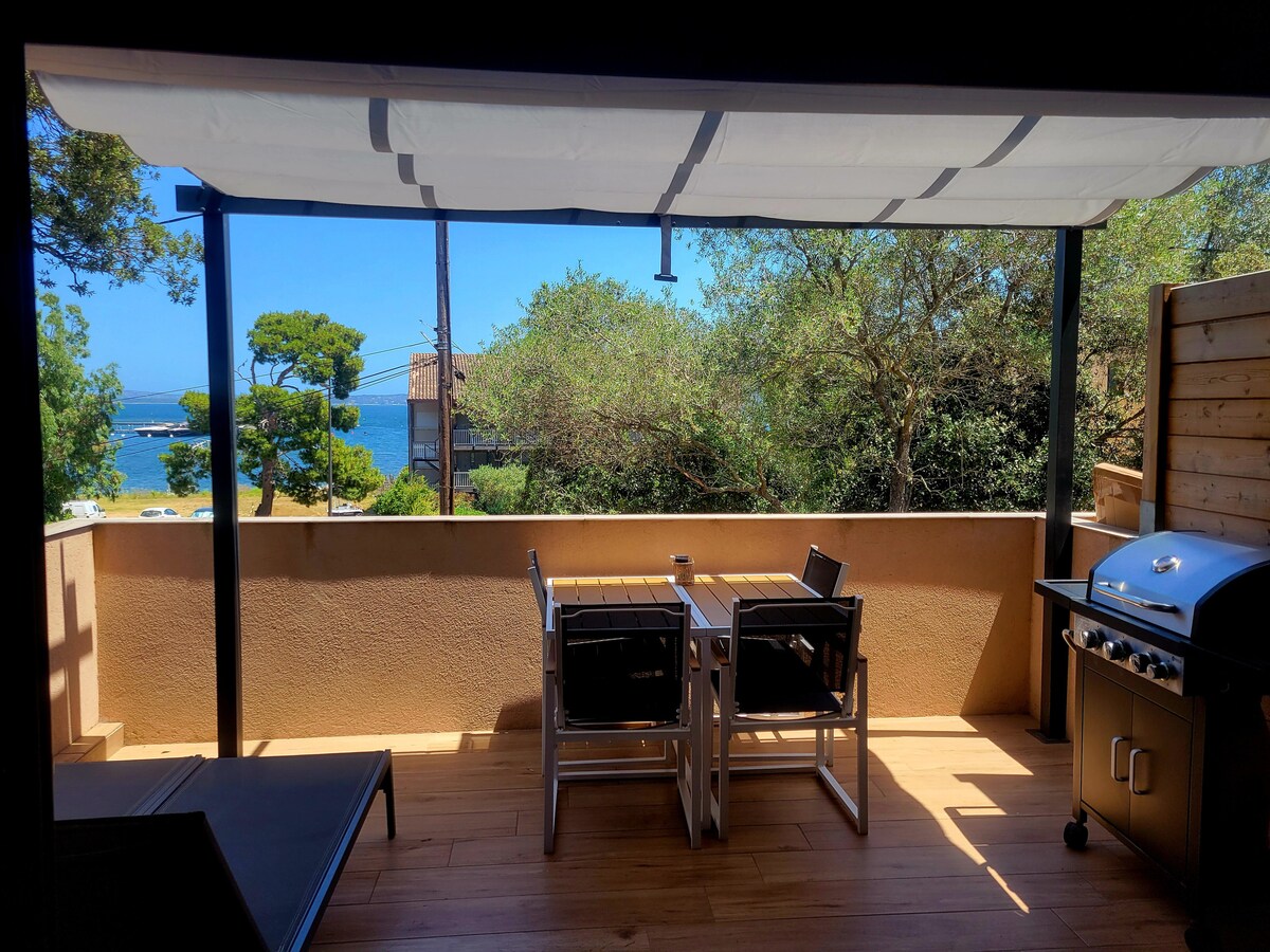 Belle vue panoramique devant ce joli appartement indépendant en rez de villa grand confort climatisé et décoré avec soin. La TAXE de séjour est incluse ds le tarif Propriété sécurisée fermée par un portail électrique. Chambre lit double haut de gamme, dressing salle d'eau douche+wc - Salon 1 canapé tv Cuisine ouverte full équipée, Cellier range bagages 1 wc séparé et son lave-mains 1 L/L- belle terrasse, plancha électrique