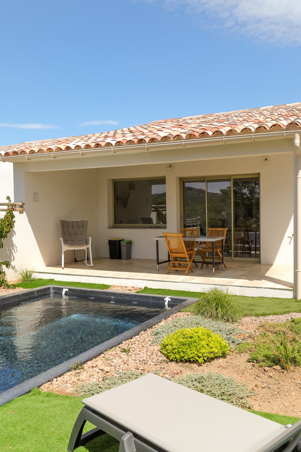 Location sur Porto-Vecchio d’une Villa de 2/4 personnes. Chaque villa dispose de sa piscine privée et chauffée (hors Juillet/Aout), exclusive aux locataires. Aussi, chacune est équipée de volet roulant pour plus de sécurité. De fin Novembre à fin Mars, piscine non chauffée. À seulement 1500m de la magnifique baie de Santa Giulia, notre résidence de tourisme 4* A Casa di Santa Giulia avec vue montagne. Superficie de 65m2 avec la terrasse, villa de plein pied.