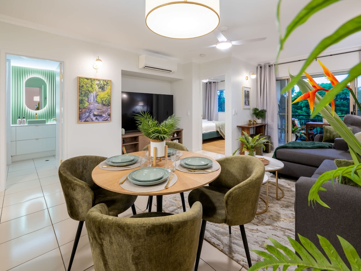 Welcome to The Green Place, a spacious 2-bedroom apartment in tropical Far North Queensland. Inspired by jungle surroundings, our unique and luxurious holiday apartment transports you to the tropics. *Free WiFi & Parking *Flexible Bedding *Fully Stocked: Essentials, extra towels, laundry supplies *Workout space w/ pedestal bike Located in the Lakes Resort, with access to 4 pools and treetop views from the third floor (stairs only). Plus we're only 10 minutes from Cairns CBD and the airport.