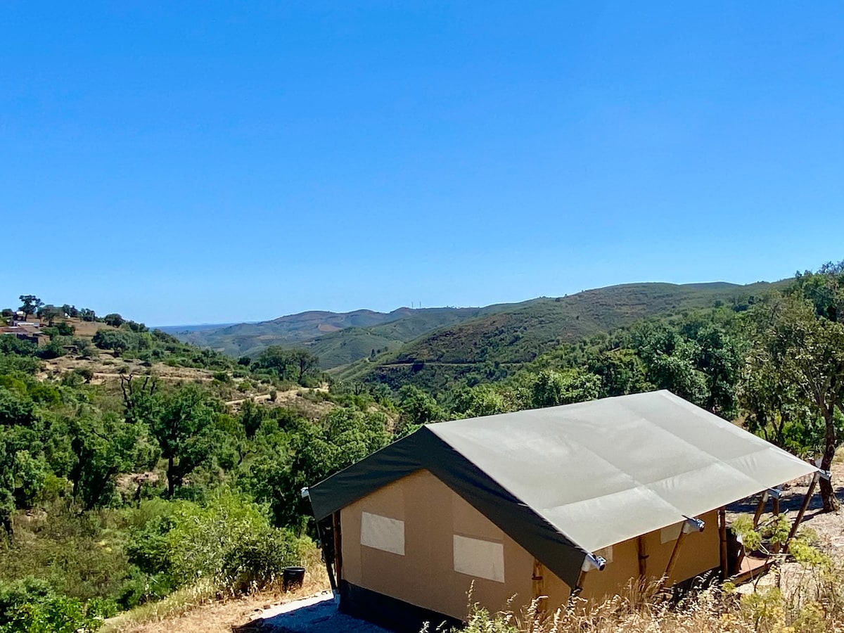 Enjoy this luxurious tent with stunning view! The tent has everything you need, a hot shower, nice kitchen, coffee machine and more. You'll have your own private terras with hammok with the most amazing view. This is the perfect place to rest and to experience authentic Portugal. You can do the wonderful hikes and within 35 min you're at the beach in Fuseta. It's high in the mountains so there's a nice breeze that, because of all the windows, even cools the tent inside.