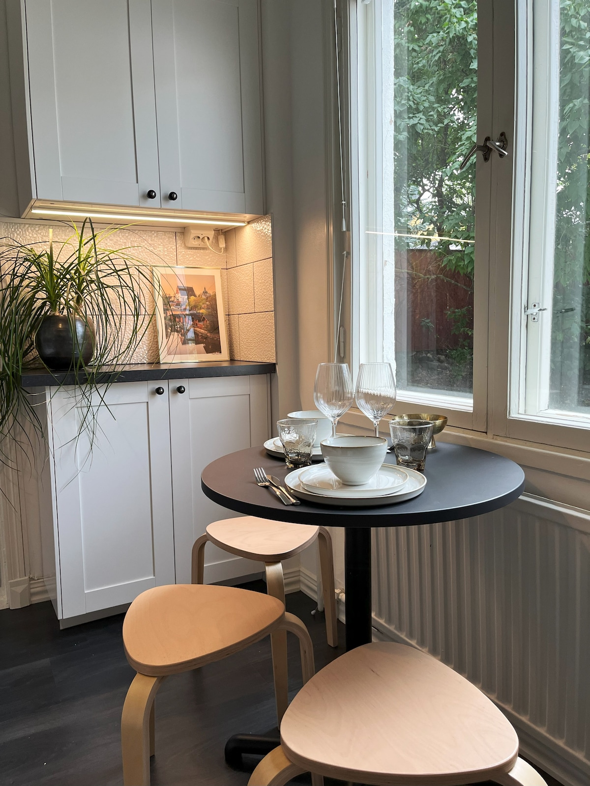 Lägenheten är i ett gammalt trähus från 1800-talet beläget vid åstranden nära centrum. På åstranden finns mysiga caféer och restauranger. Huset är trivsamt, tryggt, tyst och lugnt. I lägenheten finns en dubbelsäng uppe på loftet och en enkelsäng nere i rummet. Det finns ingen TV eller radio i lägenheten.