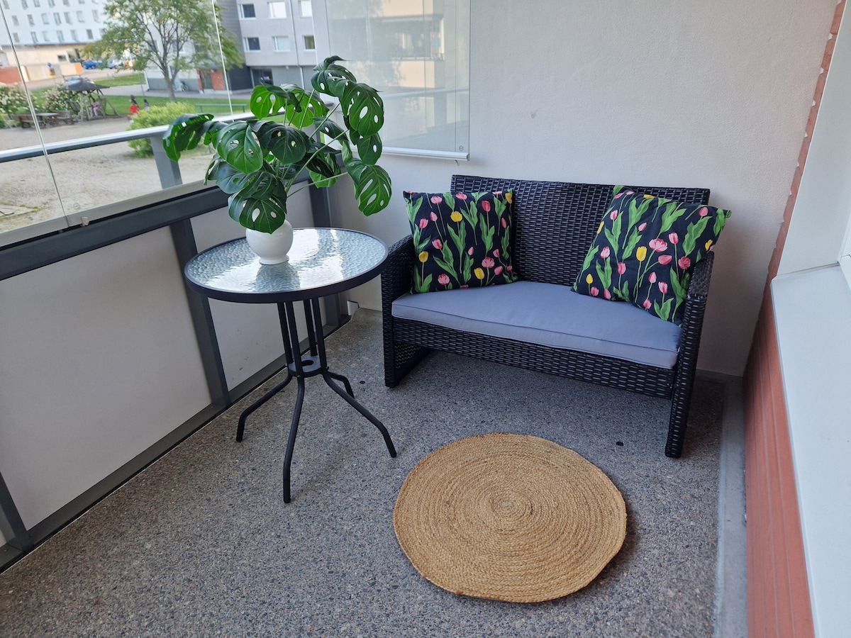 Take it easy at this unique getaway and enjoy your stay in this fairly new 34 m2 condo & studio (+13 m2 balcony). Calm neighborhood with excellent transportation connections makes accommodation comfortable and makes you feel like home. The bus stops are located right near near the apartment and the metro station is only a 5-minute walk away (450 meters from the apartment) which takes you to the city center within 12 minutes.