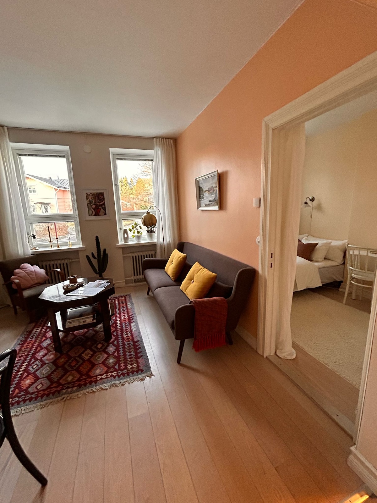 Lägenheten är i ett gammalt trähus från 1800-talet beläget vid åstranden nära centrum. På åstranden finns mysiga caféer och restauranger. Huset är trivsamt, tryggt, tyst och lugnt. I lägenheten finns en dubbelsäng uppe på loftet och en enkelsäng nere i rummet. Det finns ingen TV eller radio i lägenheten.