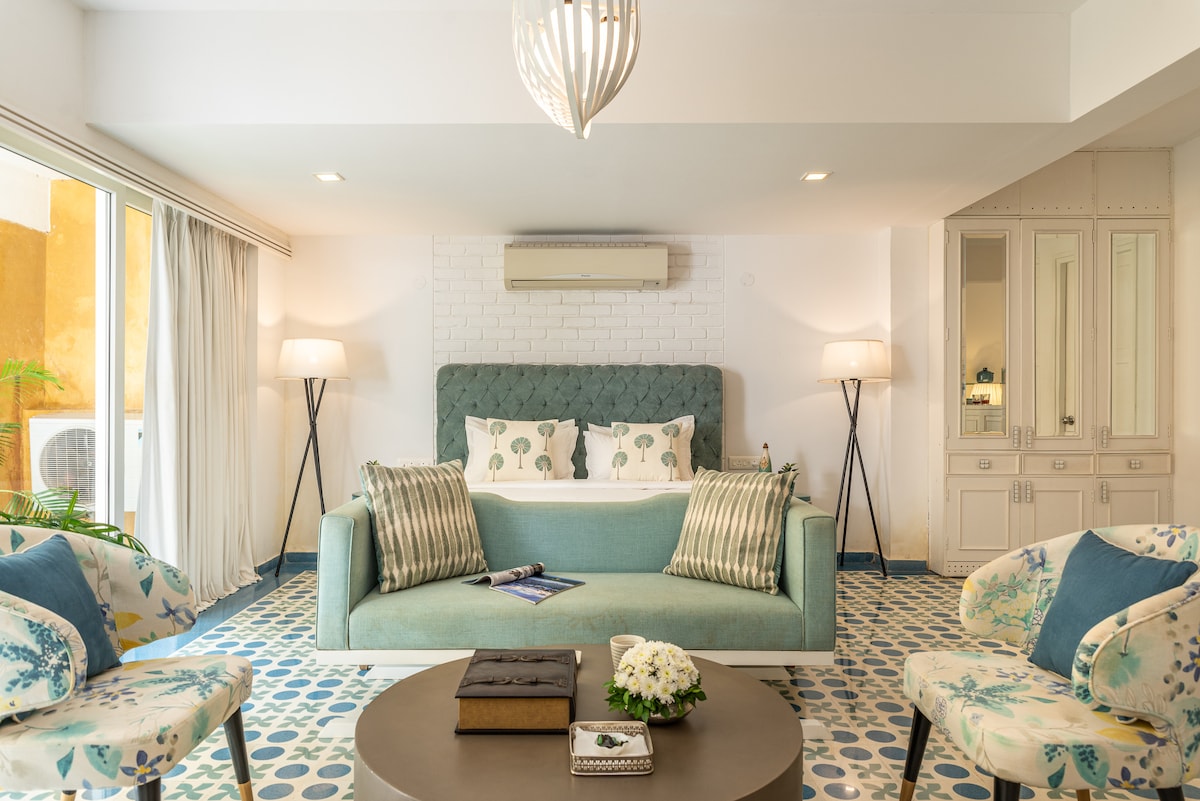 Experience refined comfort in the heart of Fontainhas, Panjim’s most vibrant, and historic quarter. This elegant neo – Art Deco apartment blends boho chic with premium design, offering a luxurious and intimate stay for up to four guests. Every detail exudes elegance and ease. Step outside to Goa’s culinary heart – beside one of India’s Top 100 restaurants, and moments away from seven more acclaimed dining gems.