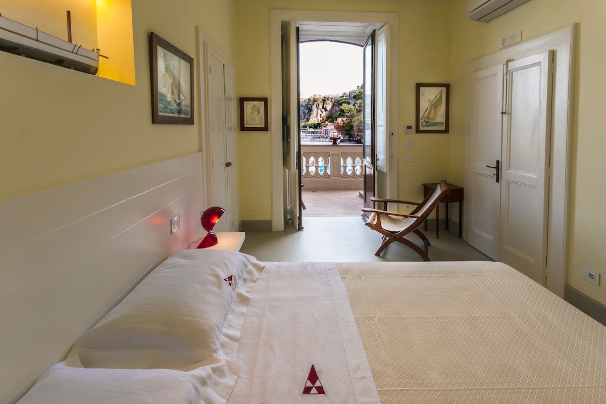 Full Sea view with balcony. Big double room, with private bathroom,frigobar, tv, A/C. Far from the center, but with easy access to the town, 20 min by walk, or 10 with local bus. Tourist tax is 2,50€ per person per night to pay in cash at the check-in, thank you. After 18:00 (on request and avaibility 2 days in adavance) is permitted late check in with an additional fee.