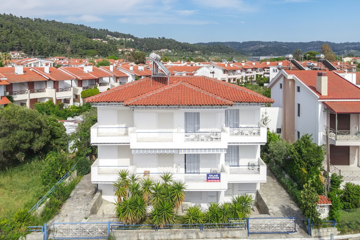 30 metres from the beach (90 feet) , at Pliades estate in Siviri. Cozy and bright house with a SMART TV & Wi-Fi big refrigerator washing machine microwave stove and oven air conditioning included! Suitable for maximum 4 people, families etc. On the first floor of a complex. Right up to the sea with a good breeze at night! 25km from Sani Beach and just 10km from Kallithea and 15km from Afytos.