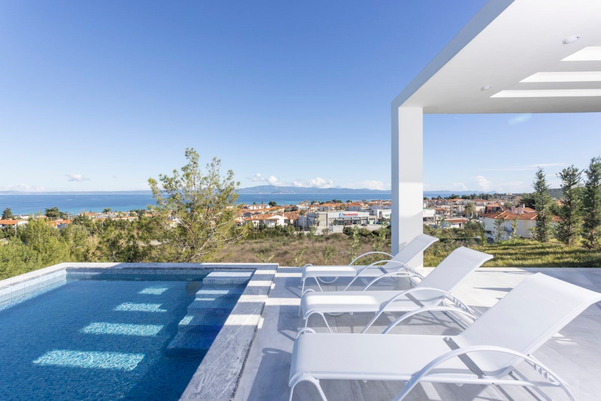 Luxurious private villa in Nea Fokea, Halkidiki with a private heated pool, 5 bedrooms, 4 modern bathrooms, 2 kitchens, high-speed Wi-Fi, big balconies, and a large landscaped garden filled with lush green grass. Just 500m from the crystal-clear waters of the Aegean Sea, the villa is the perfect getaway for families or groups of up to 10 guests looking for a comfortable and relaxing vacation.