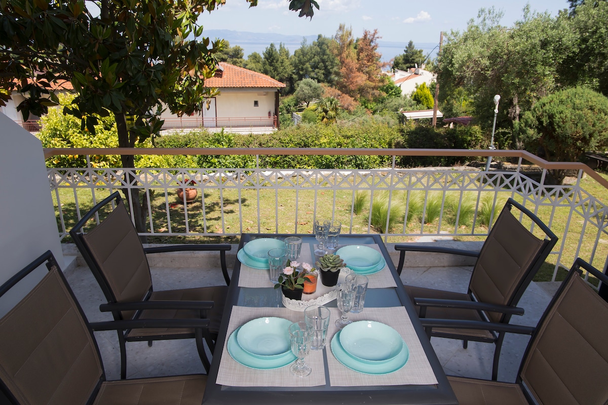The 2-bedroom comfortable, ground floor apartment (5 persons), 200m from a sandy beach, beautifully located, overlooking the Gulf, surrounded by fruit trees and pines. With 2 A/C and mosquito nets, we have a fully equipped (kitchen with a stove, dishwasher, microwave, coffee maker, toaster, kettle, and washing-dryer machine). Playground for our little guests! With a private parking area FREE WIFI (can also connect with ethernet cable) Only 90km from the airport of Thessaloniki.