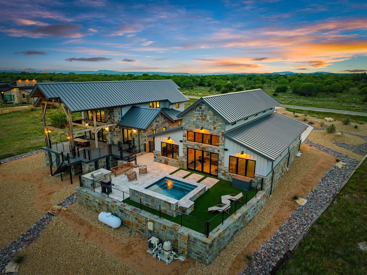 Escape the city and enjoy quality family time on 8 private acres with the most amazing Texas Sunset views. Start your day with coffee on the patio talking to the many birds that love the sunrise around the cabin. Then get your hiking boots on and explore the hiking trails and natural rock forts that cascade down the canyon trails. After your trail hike, enjoy a nap in the hammocks to recharge. Then end the day watching the most beautiful sunset views from the Cowboy Pool!