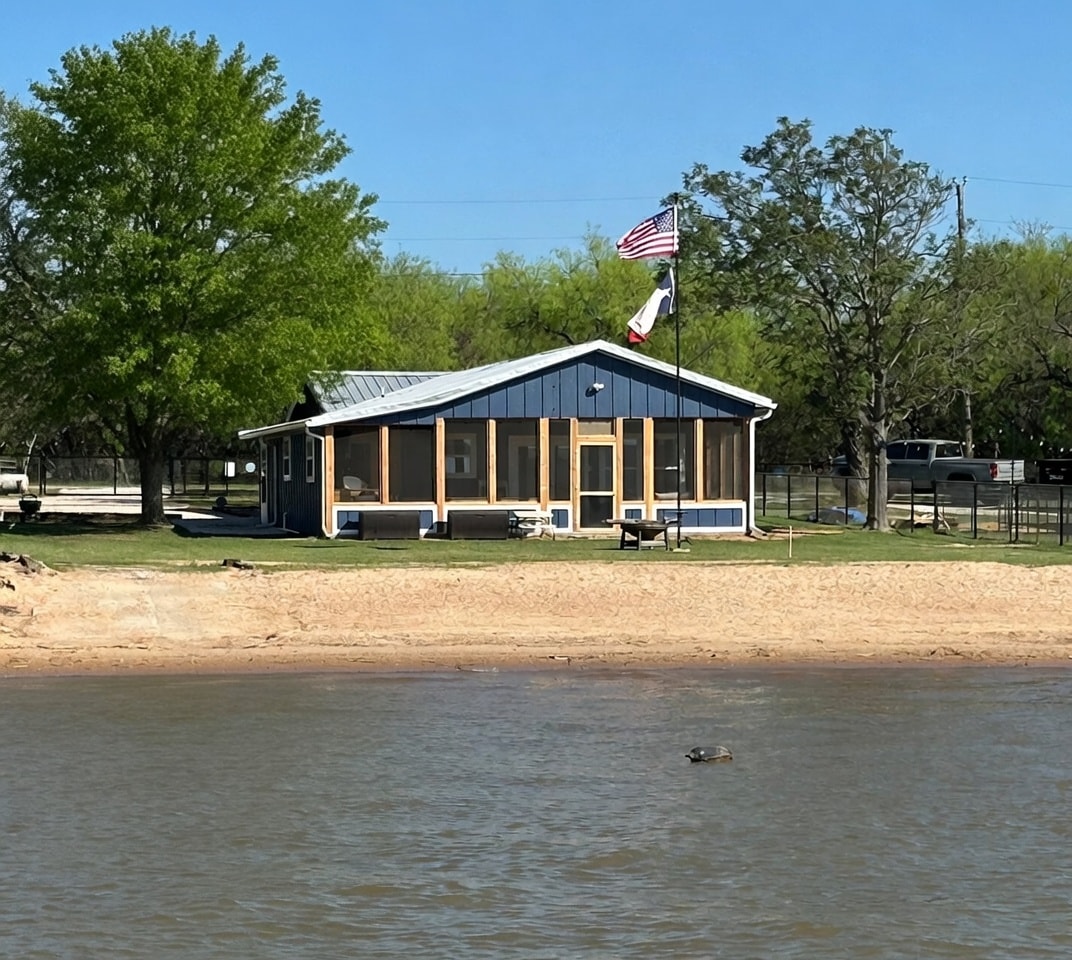 Relax with the whole family at this peaceful place to stay. Across from Possum Kingdom Airport. Only 10 min to Rocker B Ranch. Perfect Sunroom that opens up to Lake with glass garage doors on the quiet side of the lake. Swim right out the back yard with this Lake front property. Property does not have a dock, but you can anchor a boat or hook up jet skis. Plenty of parking. 20 min boat ride to Hells Gate.