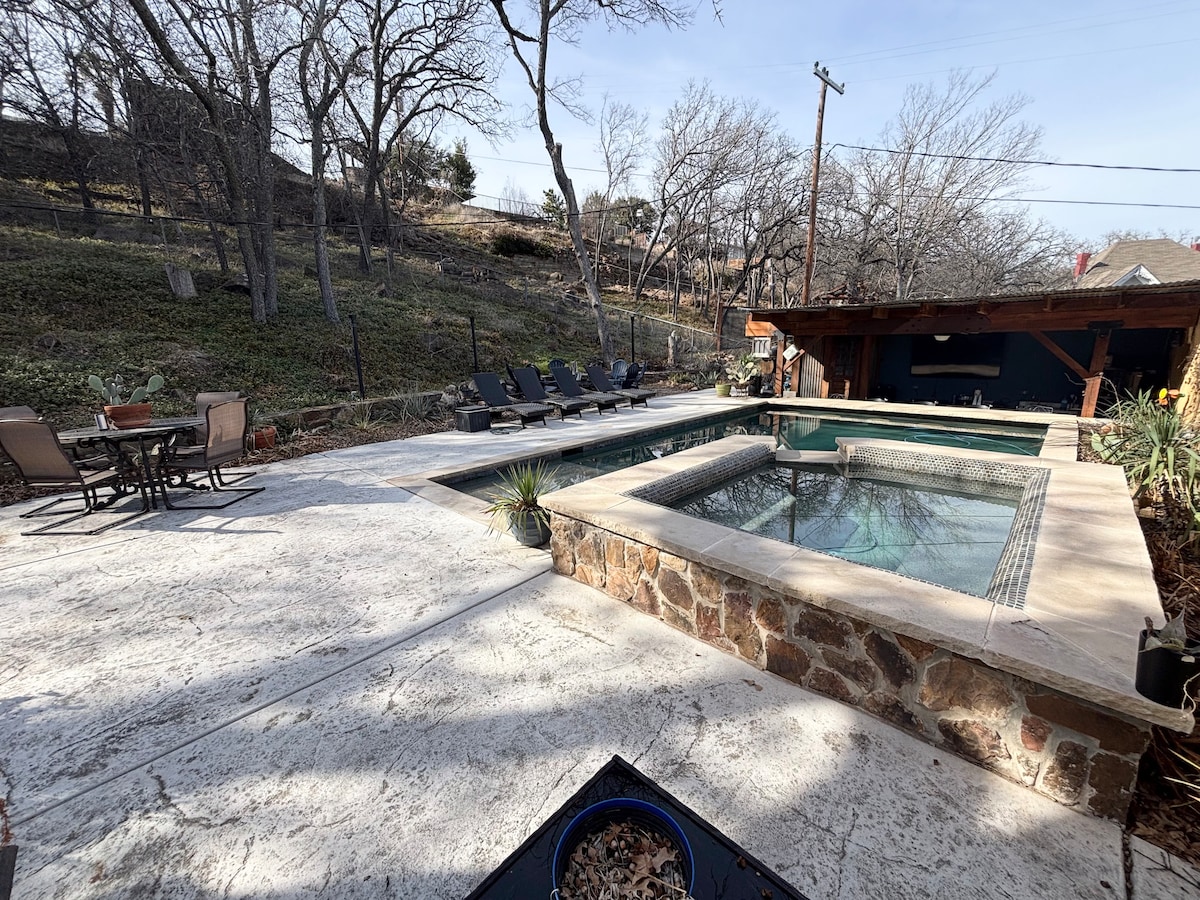 Escape the city and enjoy quality family time on 8 private acres with the most amazing Texas Sunset views. Start your day with coffee on the patio talking to the many birds that love the sunrise around the cabin. Then get your hiking boots on and explore the hiking trails and natural rock forts that cascade down the canyon trails. After your trail hike, enjoy a nap in the hammocks to recharge. Then end the day watching the most beautiful sunset views from the Cowboy Pool!