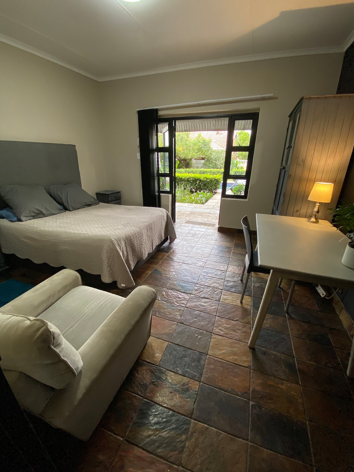 The Paddock is the newest self catering unit Tierra Pequena B&B has to offer. This bachelor's unit is designed with an open plan outlay for easy movement, suitable for 2 adults and 2 children under 12, or 3 adults. The paddock-style enclosed garden caters for small pets only. Enjoy your early morning coffee on the stoep overlooking the stables. Our huge gardens, swimming pool and patio area, ensures that all guests can enjoy some private time outside On a farm, yet in town!!