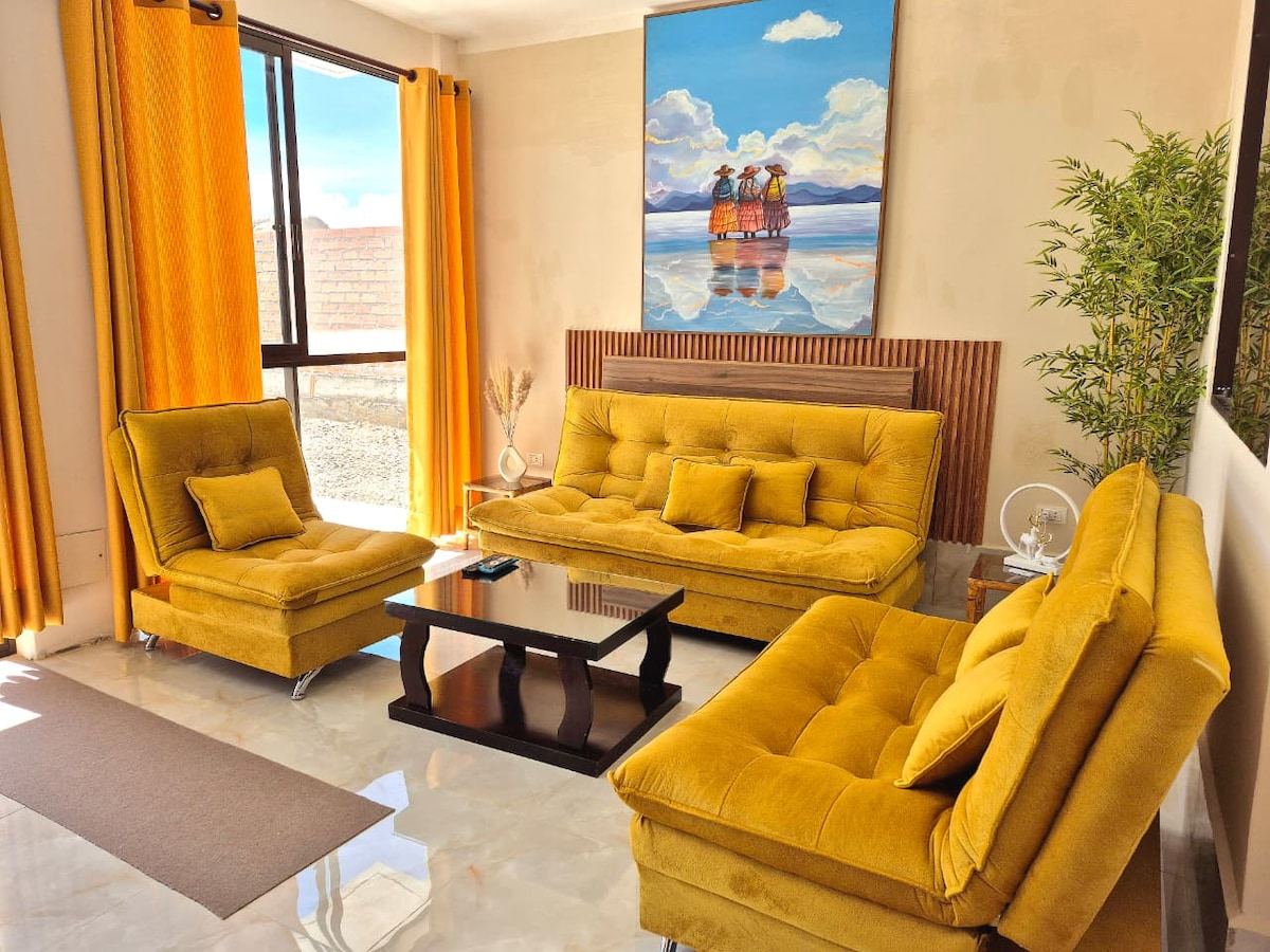 Moderno y acogedor departamento en el corazón de la ciudad! Ubicado a minutos de la plaza principal, rodeado de clínicas, cafés, gimnasios y bancos. Disfruta de este departamento único, diseñado para que te sientas como en casa. Con capacidad para cuatro personas, ofrece cómoda cama matrimonial en el dormitorio, un amplio sofá cama de dos plazas en la sala, un baño moderno y un antebaño. La exquisita decoración crea una atmósfera acogedora y cómoda. Haz de tu visita una experiencia inolvidable!