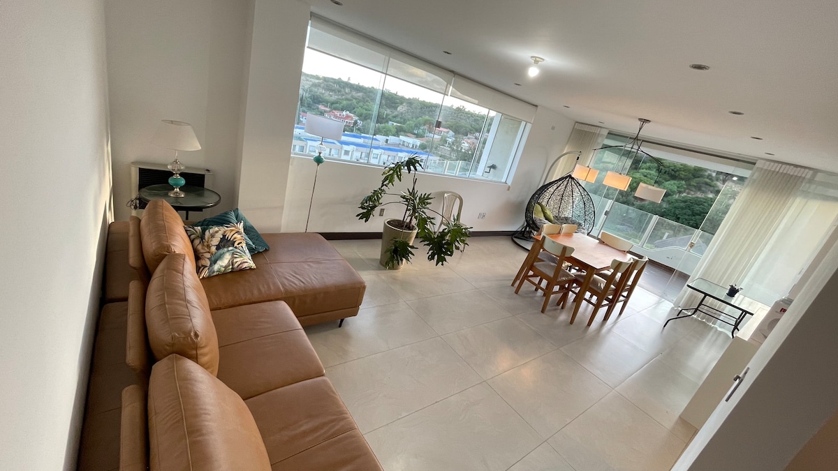 Lleva a toda la familia a este fantástico lugar con muchas zonas para divertirse ideal para tus vacaciones. Departamento de 3 dormitorios: - 1 en suite con baño/Yacuzzi, vestidor y terraza privada. - 2 dormitorios con baño compartido y closets - Sala, comedor con terraza y parrillero. - Cocina con vajilla, microondas, licuadora y jarra eléctrica. - Lavandería con lavadora y planchador. - Piscina atemperada. - A 5 minutos de la plaza principal. - Posibilidad de hasta 8 huéspedes.