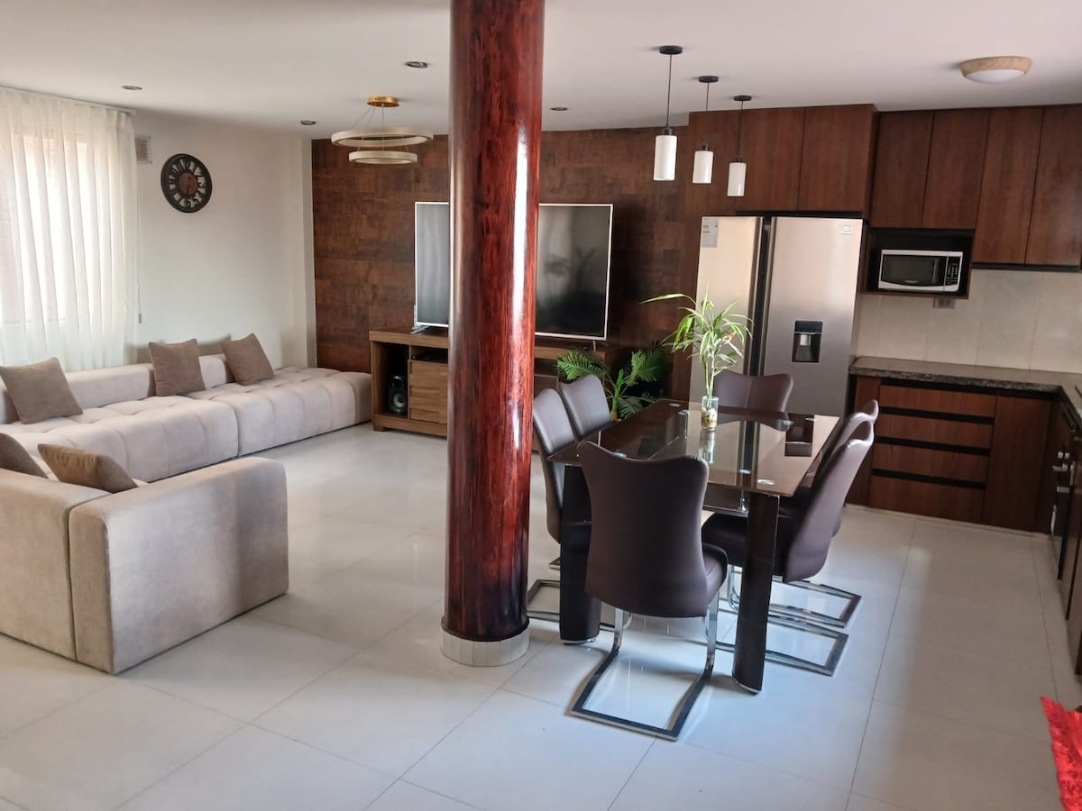 Departamento amplio y cómodo en pleno centro de Sucre, ideal para familias o grupos pequeños. Check-in flexible y WiFi. está a solo 5 cuadras de la plaza principal y 2 del mercado central, ideal para explorar todo caminando. Cuenta con 4 dormitorios, 2 baños (uno completo), living-comedor, cocina equipada, TV y WiFi. Disfruta de la vida local: restaurantes, librerías, farmacias, cajeros y comercios están a pasos de tu puerta.