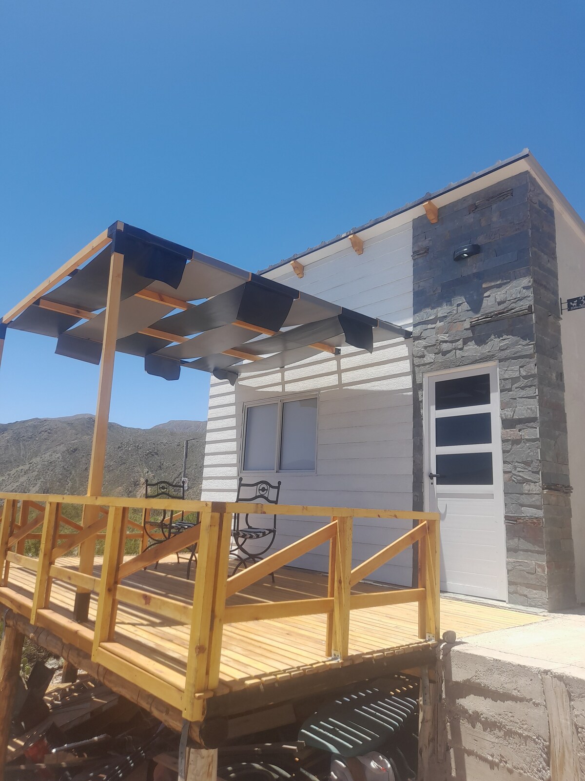 Cabaña ubicada en el corazón de la montaña Mendocina. En Manantiales, Potrerillos. Con un terreno de 2.000m y vista a la montaña podrás vivir una experiencia única de días de descanso y disfrute. Es atendida por sus dueños. Se encuentra a 50m del arroyo El Salto donde se puede apreciar la flora y fauna local. La parada de colectivo se encuentra a 20 mts. Cabin located in the heart of Mendoza mountain,in Manantiales,Potrerillos. You'll live an experience of rest days. Bus stop at 20 meters.
