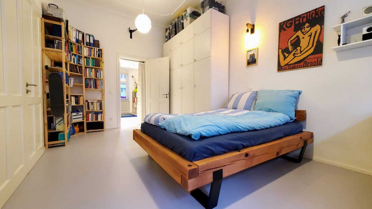 Guest room in a newly restored Berlin apartment in a historic building, with its own private garden. It was extensively renovated in 2023/24 to serve as a guest apartment and office for the hosts. It is fully equipped and located in Prenzlauer Berg, adjacent to Mitte, behind the “Soho House.” Kitchen/dining area, bathroom, and living room are available to our guests.