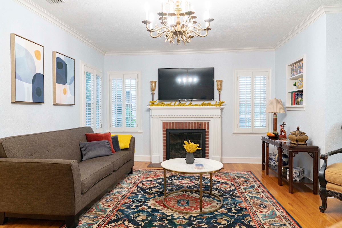 Keep it simple at this peaceful and centrally-located place with a fun botanical theme. The house has a HUGE, fully-fenced, private backyard with amenities for children to play (including a play house and a treehouse). There is plenty of room for pets to run, families to play horseshoes, tether ball, and croquet. Each bedroom has a smart TV and a queen bed with a Purple brand mattress.