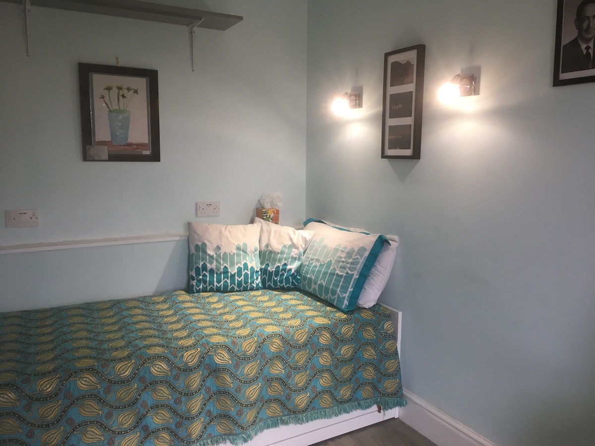 A private self-contained detached guest cottage studio room inc. King size bed, additional 2x Single (Super King) pull out, sitting area, desk / TV and separate bathroom with shower. Sleeps 4 (with pull-out bed), but very comfortable for a couple. Our lovely guest cottage is detached from a private house and has open views across the gardens. It’s light and airy and seating for 4, tea/coffee, fridge, microwave, TV and hair-dryer, and iron. Gated secure parking.