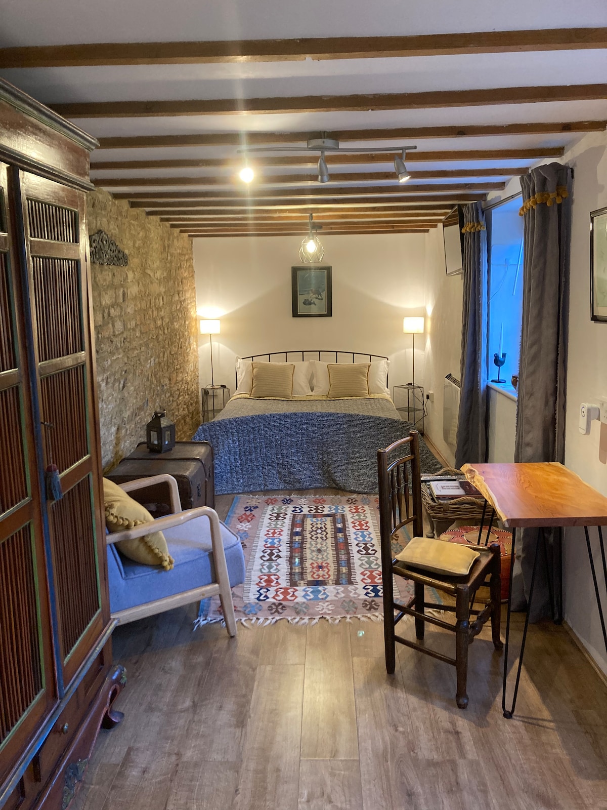 This memorable place is anything but ordinary. Stay in the Carriage House to enjoy the garden and relax in the spacious interior whether for work, a romantic break or R&R. This stone barn was renovated in 2012 by the owners, retaining the character of the original building, whilst installing underfloor heating, an air source heat pump, a fabulous kitchen, oak windows, doors and staircase and a beautiful bedroom. The location is rural and secluded in a small village close to Milton Keynes.