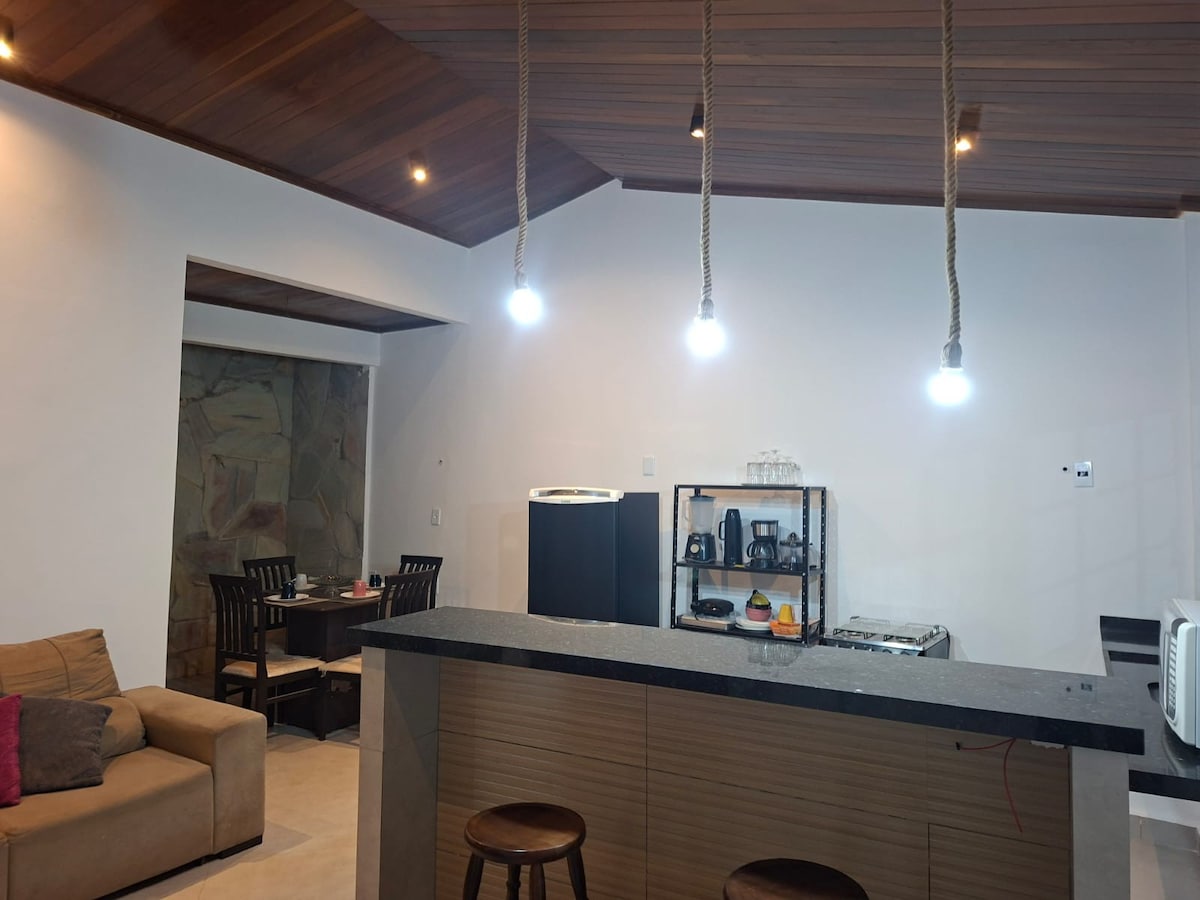 Descubra a Casinha da Praia, um refúgio encantador em condomínio fechado frente ao mar. Este aconchegante espaço conta com um quarto equipado com ar condicionado e TV, além de uma sala com um luxuoso sofá cama, perfeita para relaxar. A cozinha completa e a área de serviço com máquina de lavar oferecem praticidade. O banheiro é um convite ao conforto, com ducha higiênica e água quente. Ouça a brisa do mar enquanto desfruta do espaço Home office e da área verde externa. Venha viver a Casinha.