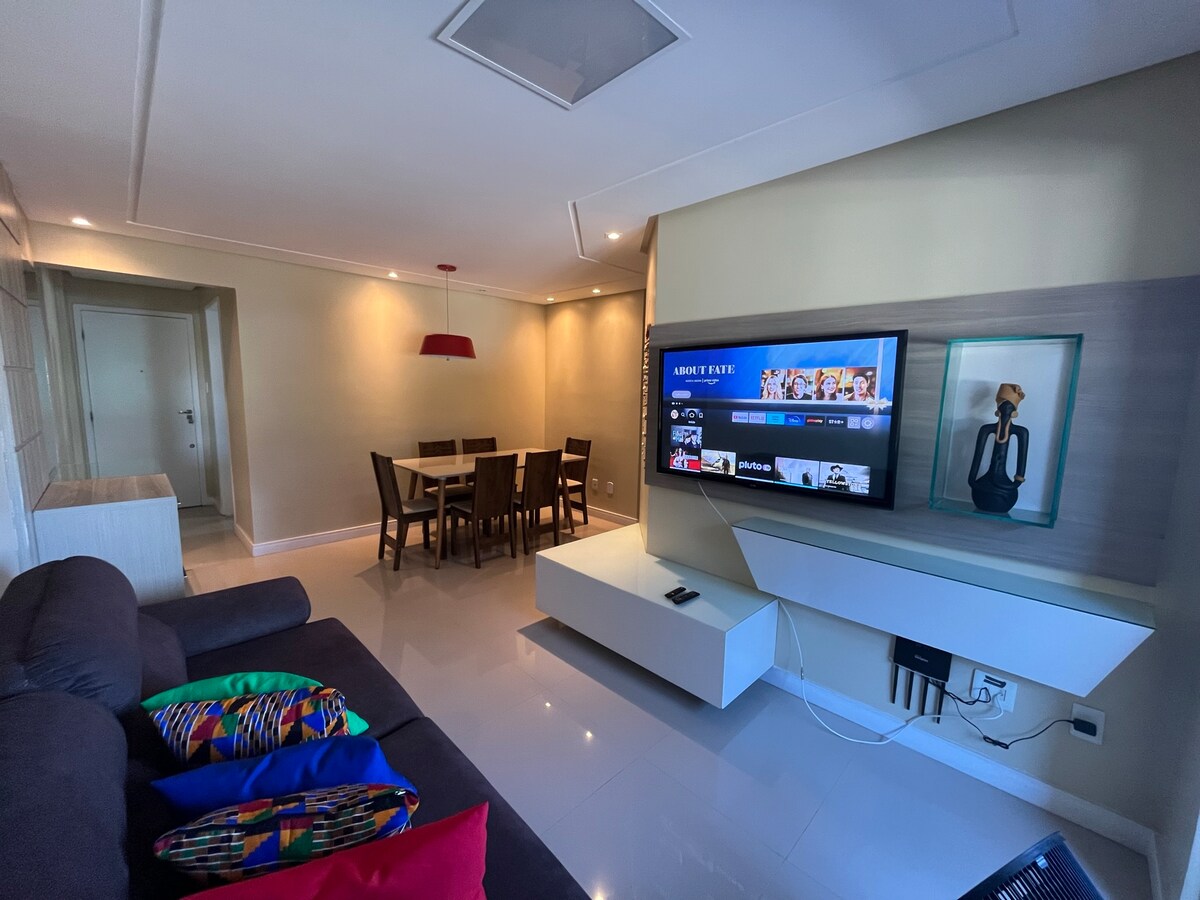 Great apartment with 50sqm, a few steps to the beach. Cozy 1 bedroom with double bed, bedside table, chest of drawers and clothes rack, living and dining room with table and double sofa bed, kitchen equipped with refrigerator, stove and accessories for the preparation of meals, service area and a wide balcony. Free garage and Wi-Fi. View to the sea. The condominium has 24 hour concierge, terrace with swimming pool, gourmet area, barbecue area, gym and a workspace in the lobby.