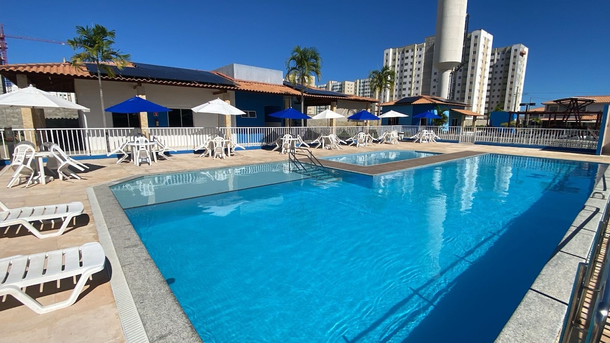 Apartamento inteiro somente para você! no espaço temos: 1 cozinha completa 1 sala de estar e jantar 1 varanda gourmet 2 quartos, ambos com ar-condicionado e ventilador 2 colchoes de solteiro para as 2 pessoas 1 piscina 1 parquinho OBS: recebemos 6 pessoas no espaço, sendo 3 em um quarto e 3 no outro, lembrando que, as 2 pessoas será no colchão de solteiro extra ( 1 colchão pra cada), a divisão fica a seu critério. Em nosso espaço, você é livre... ah, pode estender para mais de 6 pessoas...