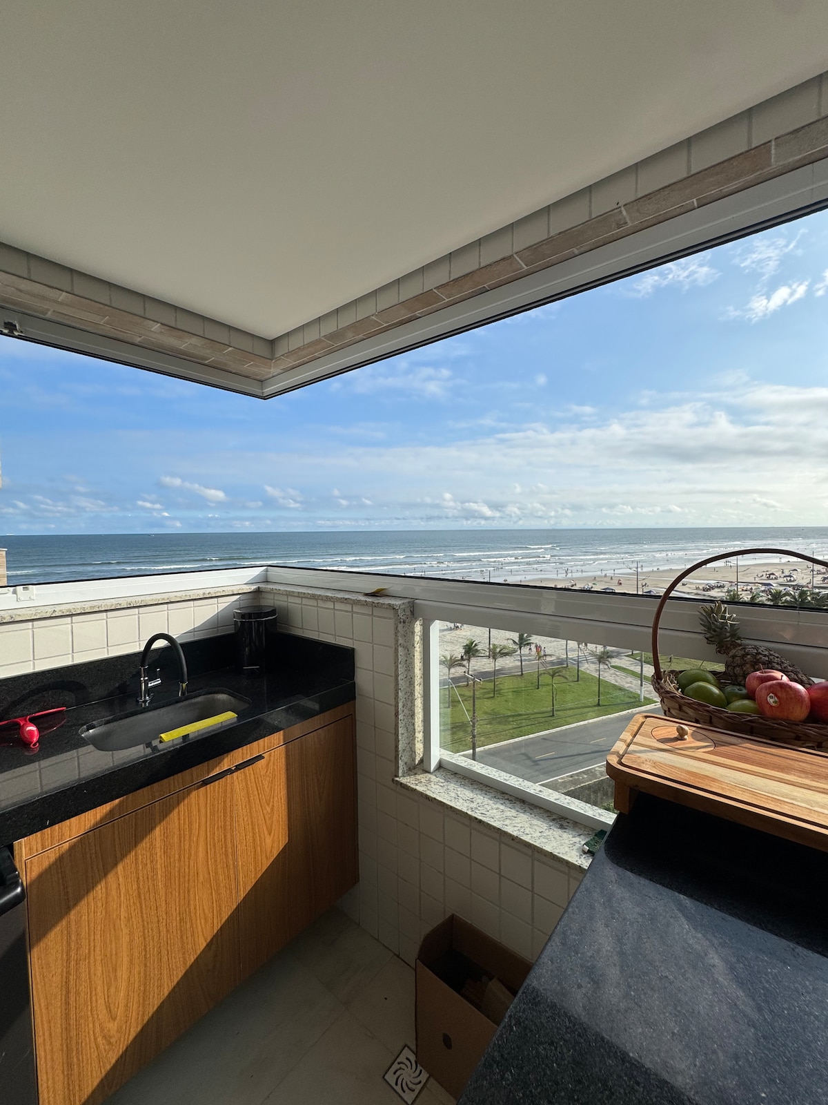 Excelente apartamento frente mar, acima do padrão, no melhor ponto da Guilhermina. Muito arejado 4 quartos, 4 banheiros, 3 vagas. Sacada gourmet, com vista frontal para o canto do forte. Você sente que está na praia sem sair do apartamento. É um camarote à beira mar, com cervejeira e churrasqueira. Estacione dentro do prédio e só retire o carro para ir embora. A poucos minutos caminhando a beira mar você conta com padarias, mercados e a Feirinha da Guilhermina.