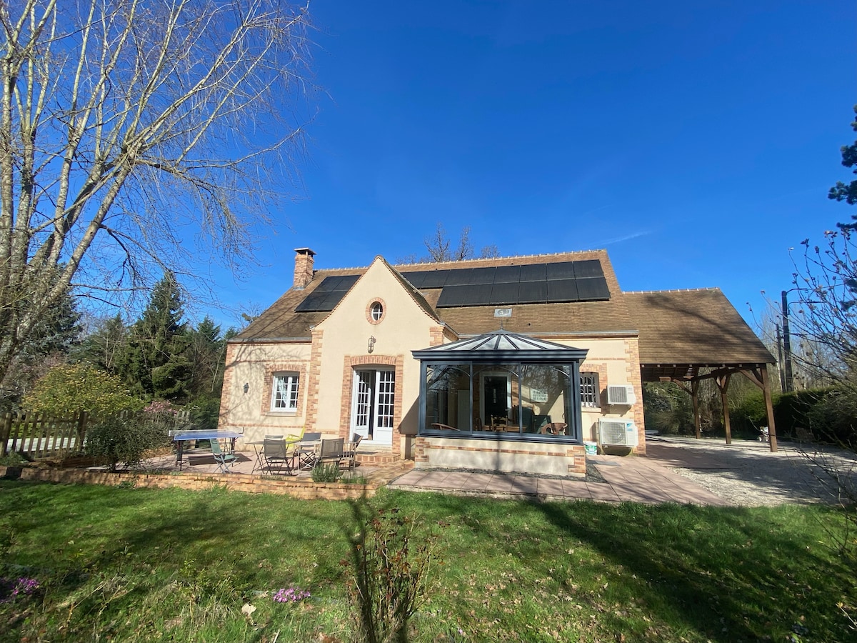 A 1h30 de Paris, maison de charme dans un village typique et jardin entièrement privatif avec jacuzzi, ping-pong, trampoline et piscine. Maison douillette car bien isolée et bien chauffée avec une grande pièce à vivre très conviviale. Belle terrasse exposée plein sud avec espace repas et bains de soleil. Immense jardin autour de la maison Wifi haut débit et charge pour voiture électrique sur demande. Piscine ouverte du 30/04 au 30/09. Animaux bienvenus mais déconseillé pour les animaux fugueurs