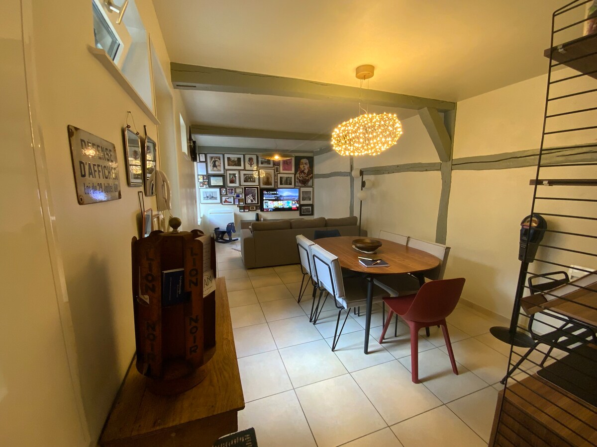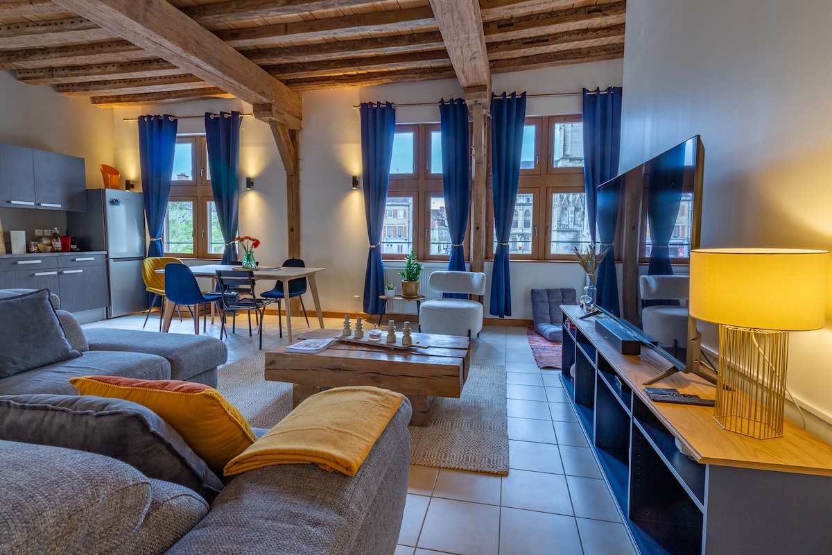 At the foot of the cathedral, with free underground parking (max height 2m), in the heart of the historic center, enjoy a picturesque setting and all the attractions accessible on foot: museums, restaurants, Cité du Vitrail, quays of the Seine. This bright family accommodation offers high ceilings, exposed beams, half-timbering, and a paved courtyard, in a typical Troyan building. Ideal for families and friends who appreciate history and architecture. Those sensitive to bells should refrain.