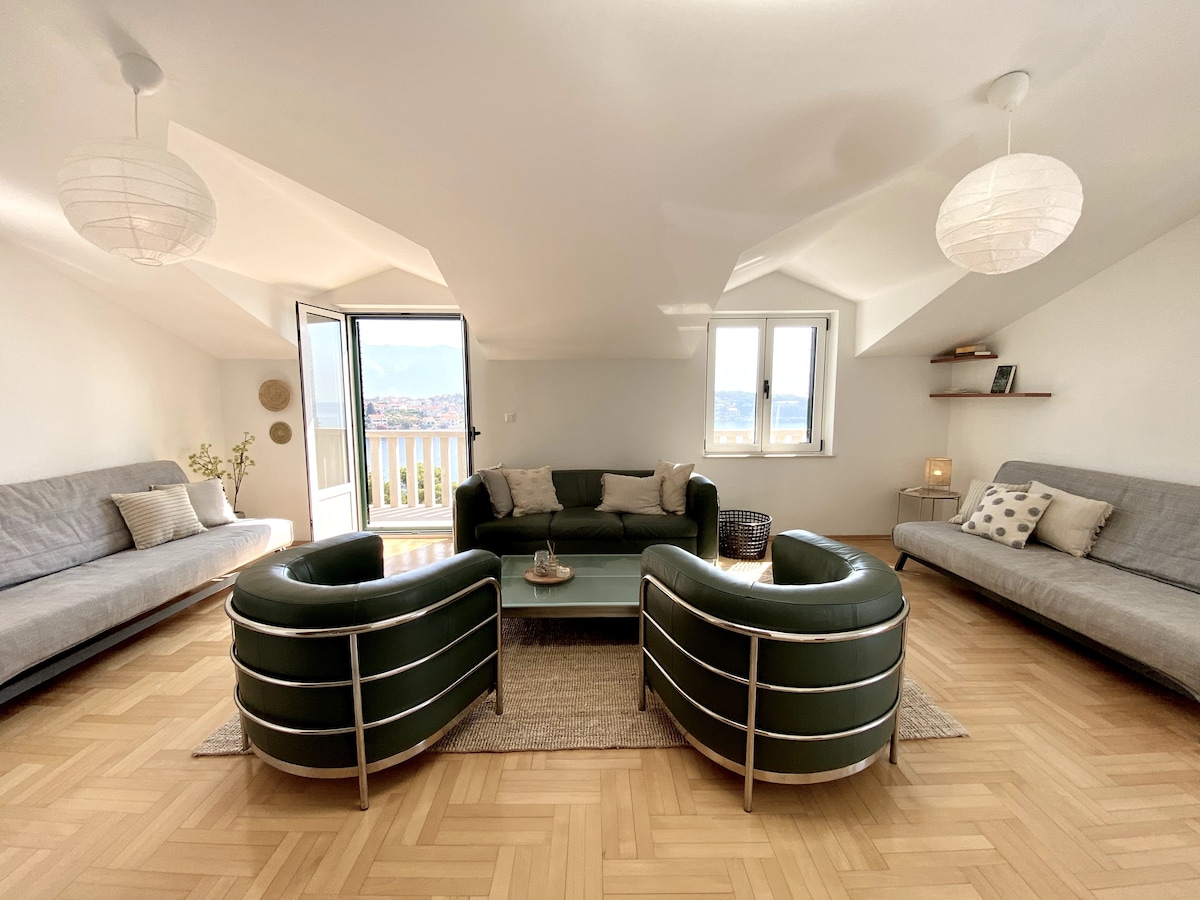 Seafront, top floor with amazing view. Situated between Split, the capital city of the Dalmatia Coast on one side and a beautiful resort of Trogir on the other side. It boasts a peaceful but convenient location, short bus drive to Split and Trogir.