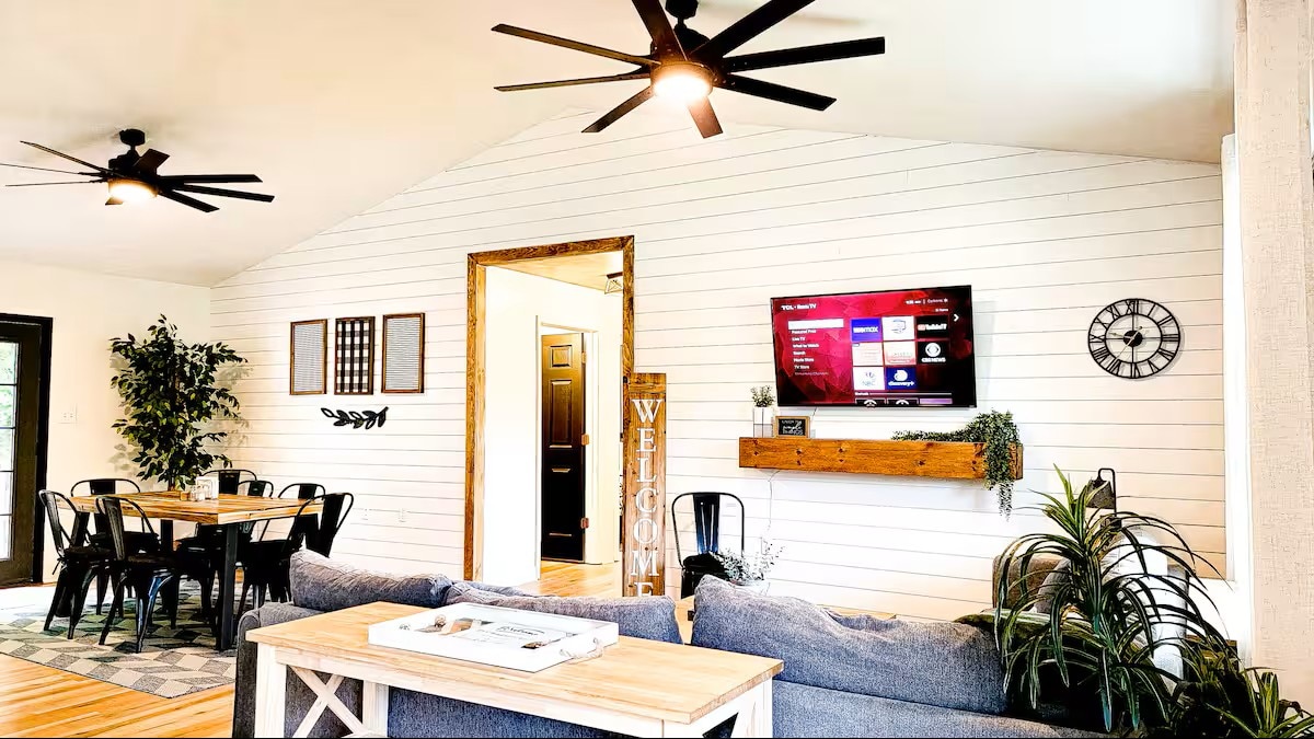 Escape to our 8+ acre retreat featuring a remodeled 3000 sq ft home with 5 bedrooms and 3 baths, accommodating up to 10 guests. Indulge in a gourmet kitchen, leather furniture, private hot tub, and arcade room. Stay connected with 300mb internet and Roku streaming. Outdoor amenities include EV charging, firewood, basketball, cornhole, and kids’ bikes. Relax in the ‘hammock hideaway’ or on the covered porches. Where we ensure your stay is unforgettable, prioritizing comfort and relaxation.
