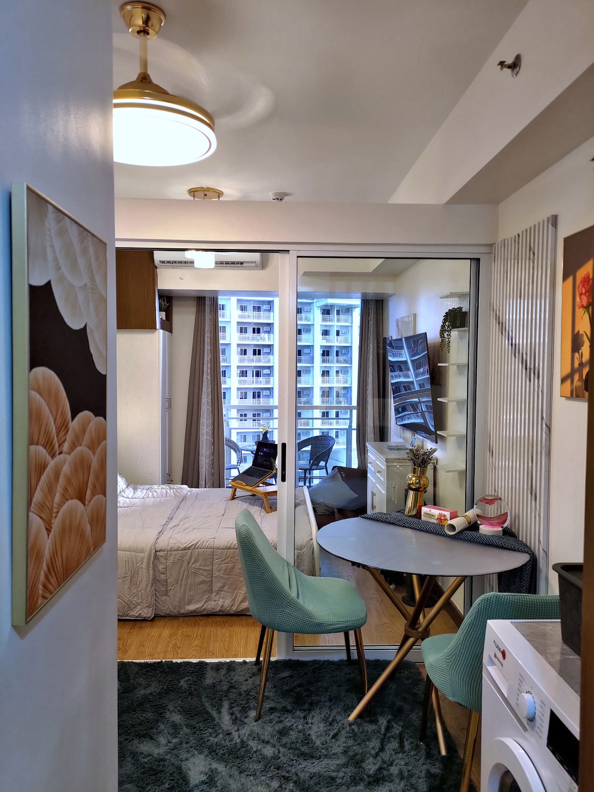 Experience style and convenience in this modern BGC studio! Just a 2-minute walk to Venice Canal Mall, it’s perfect for work and leisure. Enjoy a hidden pullout queen bed, an expanding table for dining or work, and an 84” projector for a cinematic experience. Steps from cafes, groceries, and restaurants, everything you need is within reach. Whether you're unwinding, exploring, or working remotely, this cozy retreat is the ideal staycation spot! 🎬🎮✨