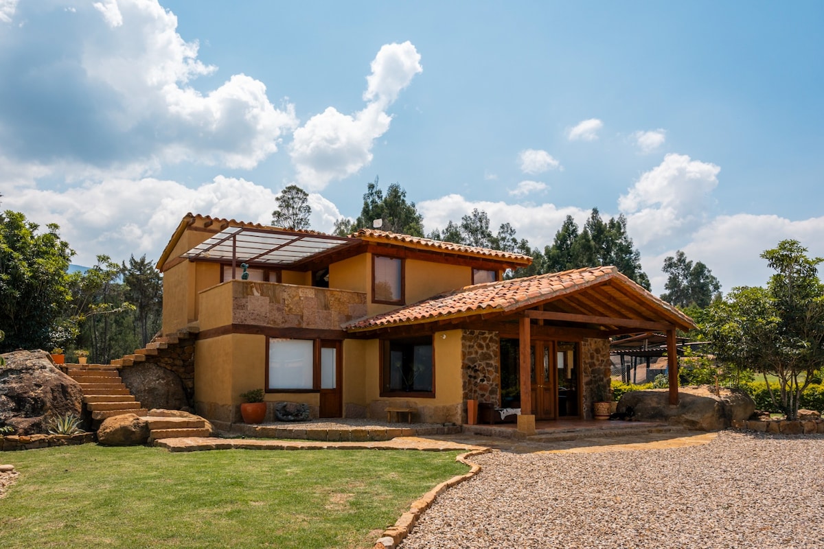 Villa de los Juanes is a perfect retreat to relax and connect with nature. Our cozy house offers two independent rooms with double beds, a dining room, a bathroom with an electric shower, a work-study, a fully equipped kitchen, an outdoor patio with BBQ, private parking, and 3,400 square meters of green space. We provide fast Wi-Fi, television, books, and board games. Let yourself be charmed by the peace that this beautiful place inspires. Only a 10-minute drive from Villa de Leyva (5 km).