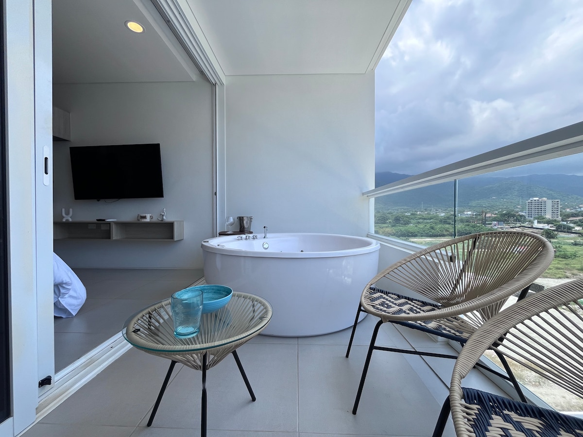 Welcome to Sierra & Sea Suite, a 1-bedroom apartment in Santa Marta. Enjoy stunning beach and mountain views from the private jacuzzi on the large balcony. The apartment includes a fully equipped kitchen and is perfect for families. The building offers three pools (including a child-friendly one) and easy access to Bello Horizonte Beach, just a 2-minute walk away. Conveniently located near restaurants, Zazué Plaza, top hotels like Hilton and Mercure, and hiking trails in the Sierra Nevada.